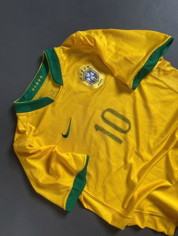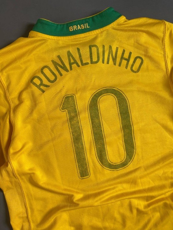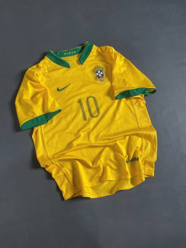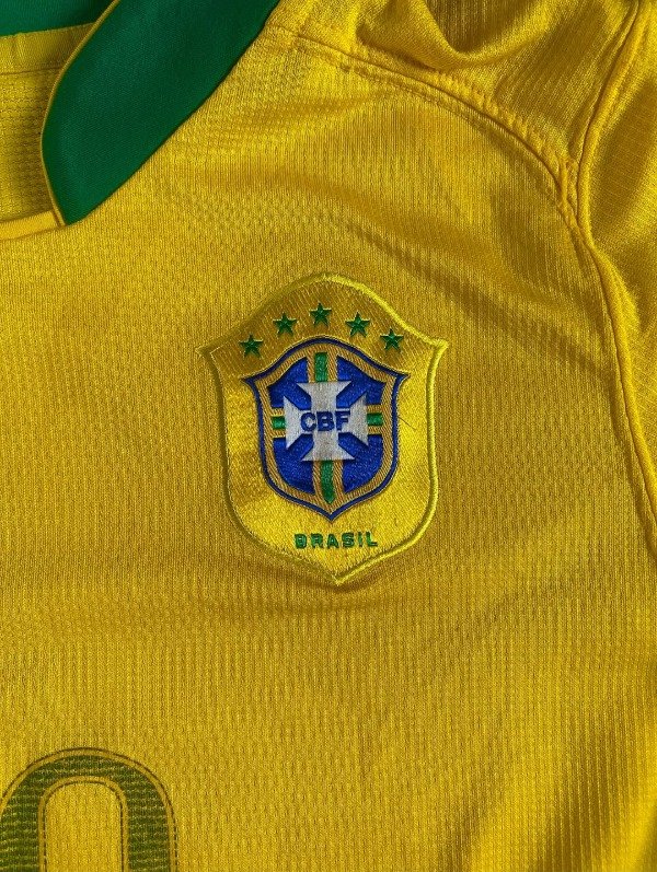 Escudo bordado con relieve, frase en la esquina derecha de la camiseta” Nascido Para Jogar Futebol”, en la parte de atrás bordado “Brasil” en el cuello. Una verdadera joya utilizada además por otros cracks como Ronaldo, Kaká, etc...