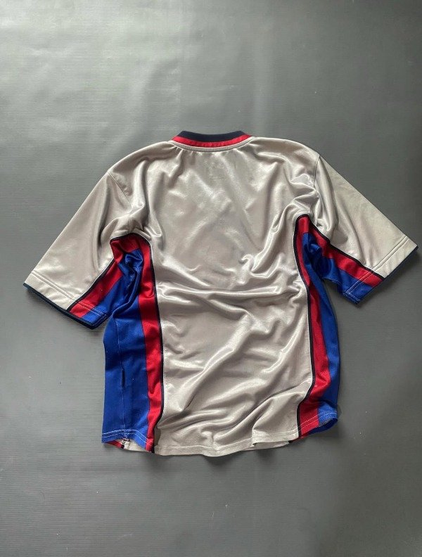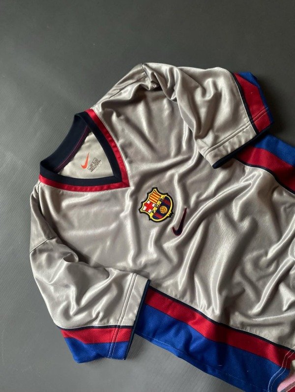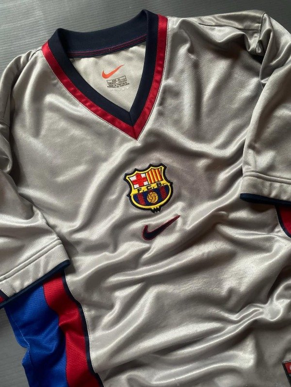 Made in Portugal. si hablamos de diseños particulares y además espectaculares, este es uno. Con su simpleza, pero a su vez elegancia destaca esta casaca como un hit del futbol de aquella época, su color plateado la diferencia del resto y a su vez demuestra la identidad del club con sus líneas azules y rojas en los laterales y mangas, como así también en el escudo bordado en el pecho, junto con la pipeta nike. Este diseño simbolizaba la ambición del equipo en una época de cambios. En esa temporada, el Barça no conquistó títulos ese año, pero el equipo contaba con grandes jugadores como Rivaldo, Patrick Kluivert y Pep Guardiola, Puyol, Xavi, Luis Enrique, etc. Volviéndose una camiseta recordada por su estilo único y por ser parte de una era de transición en el club.